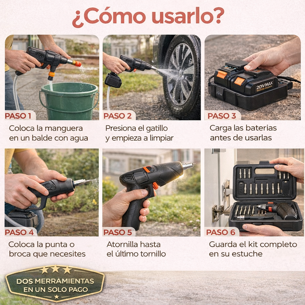 Combo PowerClean 2 en 1™ – Hidro lavadora Inalámbrica + Destornillador Eléctrico Portátil GRATIS